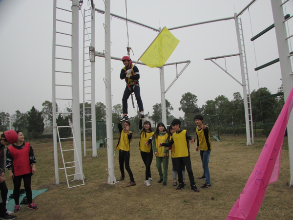 虽然身上挂满了安全保护措施,但在高空跳跃,每个人都产生了或多或少的恐惧感,从杆上站到顶端的圆盘是一次极大的考验,从圆盘跃起抓杆更是一次心理的挑战,特别是女士。有的同伴从满脸通红到面色苍白,有的战战兢兢不敢站立,有的站了许久不敢跃起。在队长的带领下,我们为每一个参训的队员鼓气,目送他们一个一个爬上摇摇晃晃的高杆,然后不断的呼喊“加油”。结果大家都顺利完成了这项训练,最后大家拍照庆贺自己的成功和胜利。